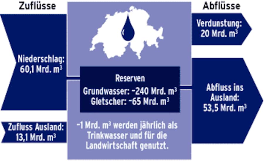 Mit Niederschlägen und Zuflüssen gelangt etwa gleich viel Wasser ins Land, wie abfliesst und verdunstet. Die Reserven betragen ein Vielfaches des jährlichen Durchflusses.