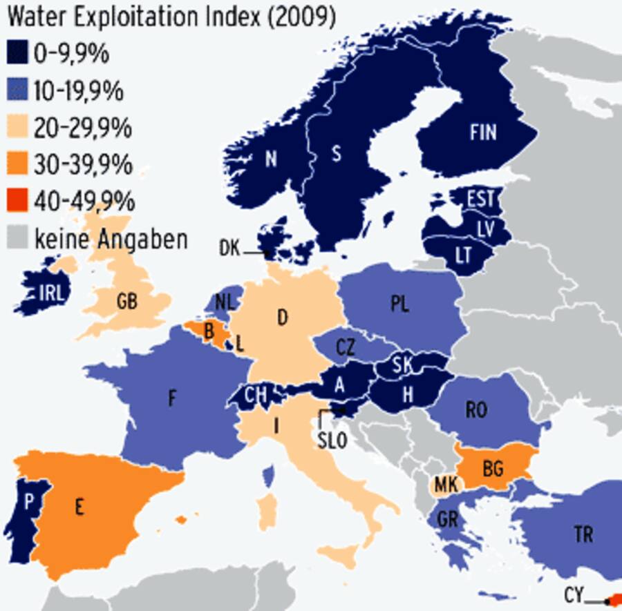 Der Water Exploitation Index (WEI) gibt den Wasserverbrauch als Prozentsatz der erneuerbaren Wasserreserven an. Der Index schwankt von Jahr zu Jahr aufgrund der Niederschläge. Länder mit einem WEI von mehr als 40 Prozent leiden unter extremer Wasserknappheit.
