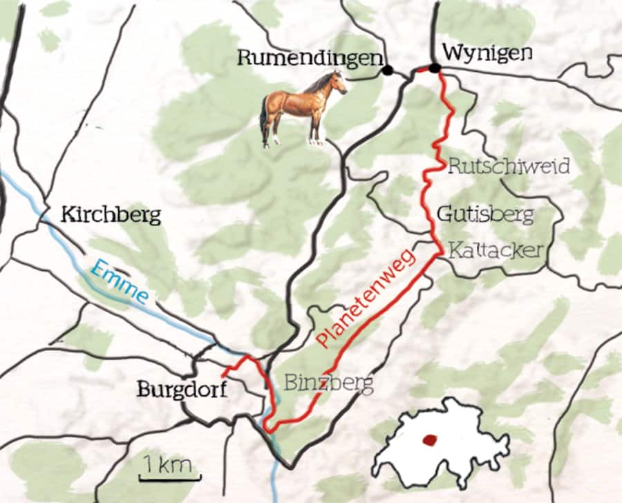 Die dreistündige Wanderung (siehe Karte) beginnt in der Zähringerstadt Burgdorf, wo man das Schloss besichtigen kann. Den Weg nach Wynigen säumen die Planeten des Sonnensystems im Massstab von 1 : 1 Milliarde. In Wynigen lädt der «Landgasthof zur Linde» zur Stärkung ein. Von Wynigen gelangt man in einer halben Stunde nach Rumendingen. Dort befindet sich die Pferdepension von Paul Schmutz, wo Arabella Biehlers Freiberger Moritz lebt: www.free-horse.ch