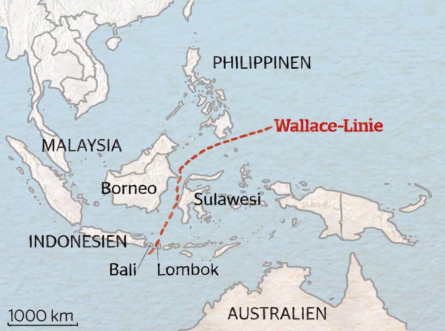 Im Malaiischen Archipel macht Alfred Russel Wallace eine überraschende Entdeckung: Auf den benachbarten Inseln Bali und Lombok leben je ganz unterschiedliche Pflanzen und Tiere. In Richtung Norden setzt sich diese Artengrenze zwischen Borneo und Sulawesi fort. Wallace erkannte als Erster, dass die Ursachen im Untergrund und in Entwicklungen in der Eiszeit liegen: Die Inseln westlich der Linie sind mit dem asiatischen Festland, dem Sundaschelf, verbunden. Die östlichen Inseln dagegen liegen auf dem australischen Sahulschelf. Ein Tiefseegraben trennt die beiden Kontinentalsockel. Während der Eiszeiten bildeten sich innerhalb eines Schelfs Eisbrücken, über die sich Tiere verbreiten konnten. Zwischen den Schelfen aber stockten die Wanderungen. Als das steigende Meer später die Inseln isolierte, formten sich unterschiedliche Lebensgemeinschaften. Wallace’ Studien über das Phänomen machten ihn zum Begründer der Biogeographie. Das Fach setzt das Vorkommen von Arten mit der geographischen Geschichte in Beziehung. Die Artengrenze zwischen den indonesischen Inseln wird zu Ehren des Forschers als Wallace-Linie bezeichnet.