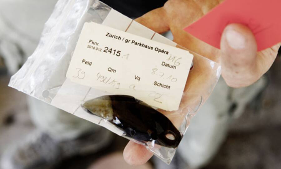Das «Trüffelschwein» sitzt in der Sonne und raucht. Noch eine Minute, dann geht es zurück in den Stollen. Tom Utiger ist stolz auf seinen Rufnamen. «Trüffelschwein» nennen Ausgräber einen, der gute Funde macht. Dabei ist der Berner Oberländer ein Quereinsteiger, die archäologische Grabung mitten in Zürich ist erst seine zweite. «Ich bin das Greenhorn unter all den Studierten und Doktoren hier», sagt der gelernte Bauarbeiter mit den tätowierten Oberarmen und grinst. Dann setzt er seinen Plastikhelm auf, trottet zum Gerüst und steigt die drei Meter hinab zur Grabung, wo zwei Dutzend Kollegen im Dreck knien.