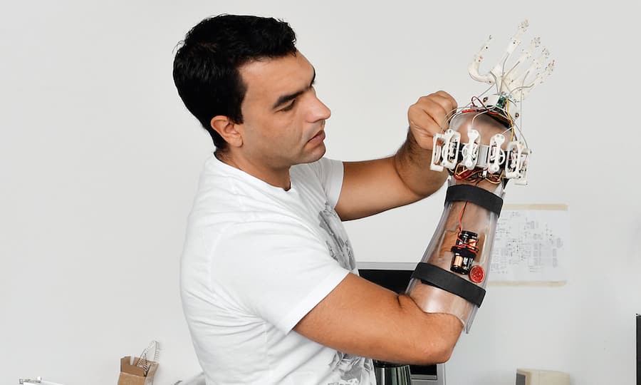 Konstantinos Dermitzakis: Wir wollen Bewegungen für den Armstumpf finden, die in einem Kontext zu dem stehen, was sie bewirken sollen. Dann könnte die Prothese aus natürlichen Bewegungen erkennen, was sie tun soll, der Träger bräuchte keine speziellen Gesten zu machen. Und ich habe ein weiteres Ziel: 10 000 Sensoren pro Fingerspitze, wie bei der menschlichen Hand, wird die Prothese zwar nie bekommen, aber es wäre schon nützlich, dem Träger motorisches Feedback zu geben, damit er weiss, was die Prothese «fühlt».