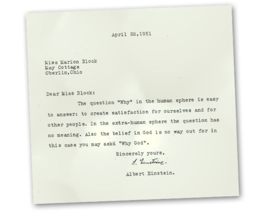 «Was ist der Sinn des Lebens?», wollte die Studentin Marion Block 1951 von Albert Einstein wissen. In fünf Zeilen beantwortete der Physiker die Frage und tat seine Ansicht über die Religion kund: