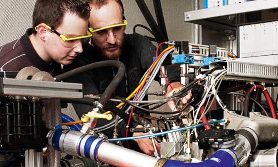 Hightech-Bastelraum: Im Keller des ETH-Gebäudes warten Doktoranden den neuen Benzin-Druckluft-Hybridmotor.