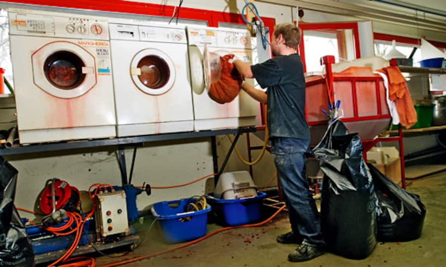 Nur saubere Fadenwürmer werden per Post verschickt: Andreas Rappold füllt die reifen Nematoden in die Waschmaschine.