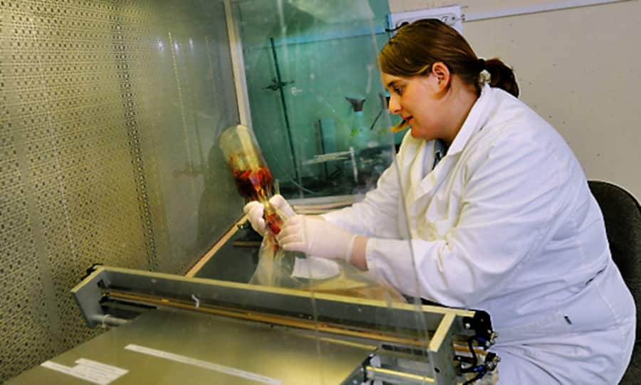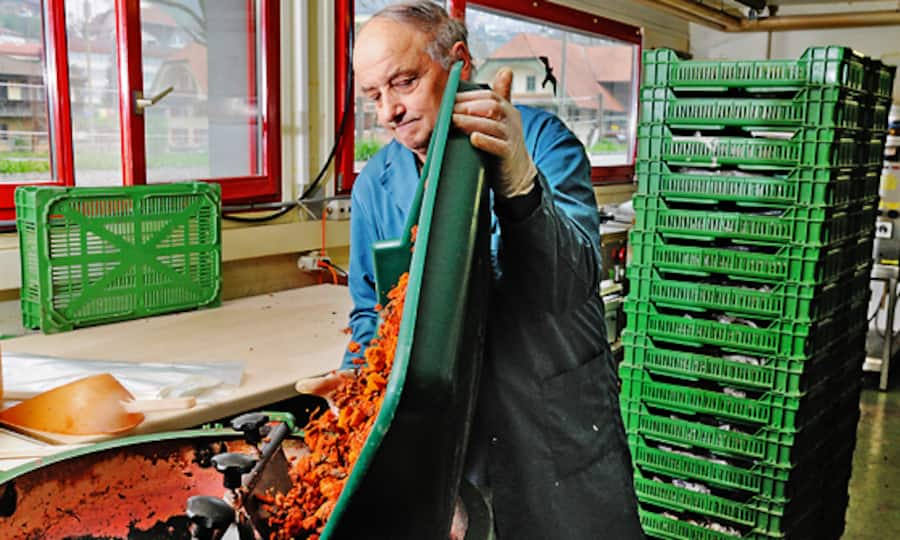 Häckermann führt die Besucher zur ersten Station in der Produktionsstrasse. Dort steht ein älterer Mann an einem Gerät, das aussieht wie ein Betonmischer – und tatsächlich auch einer ist. «Ich bin heute der Koch und bereite die Mahlzeit für die Nematoden vor», erklärt Joseph Lustenberger mit Schalk in den Augen. Die Zutaten sind pürierte Schweinsnieren, Sonnenblumenöl und Schaumstoffflocken. Sind diese sonderbaren Ingredienzen gut vermischt, füllt sie der ehemalige Käser in durchsichtige Plastiksäcke ab, die er anschliessend in eine Art Dampfkocher legt. Darin wird das Menü für die Fadenwürmer bei 120 Grad sterilisiert, damit sich keine unerwünschten Bakterien an dem Gericht gütlich tun.