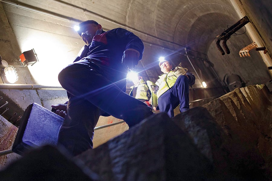 Vom «Ritz» fahren wir mit der Luftseilbahn nach oben. Rund 30 Meter unterhalb der Mauerkrone überqueren wir einen Steg, marschieren die Bergflanke entlang und betreten durch einen verschneiten Eingang die Mauer. Erst sieht man sekundenlang kaum etwas, dann heben sich die Umrisse des ovalen Stollens ab. Philippe Baumgartner und Didier Bovier setzen ihre Inspektion fort: Sie haben noch mehrere Kilometer Weg vor sich.