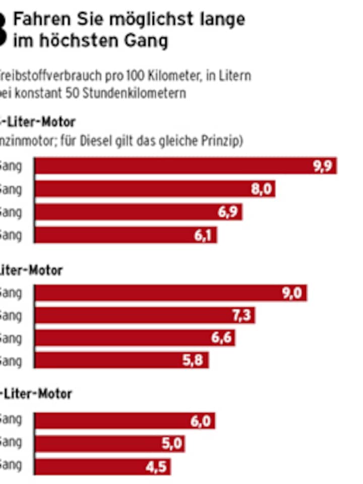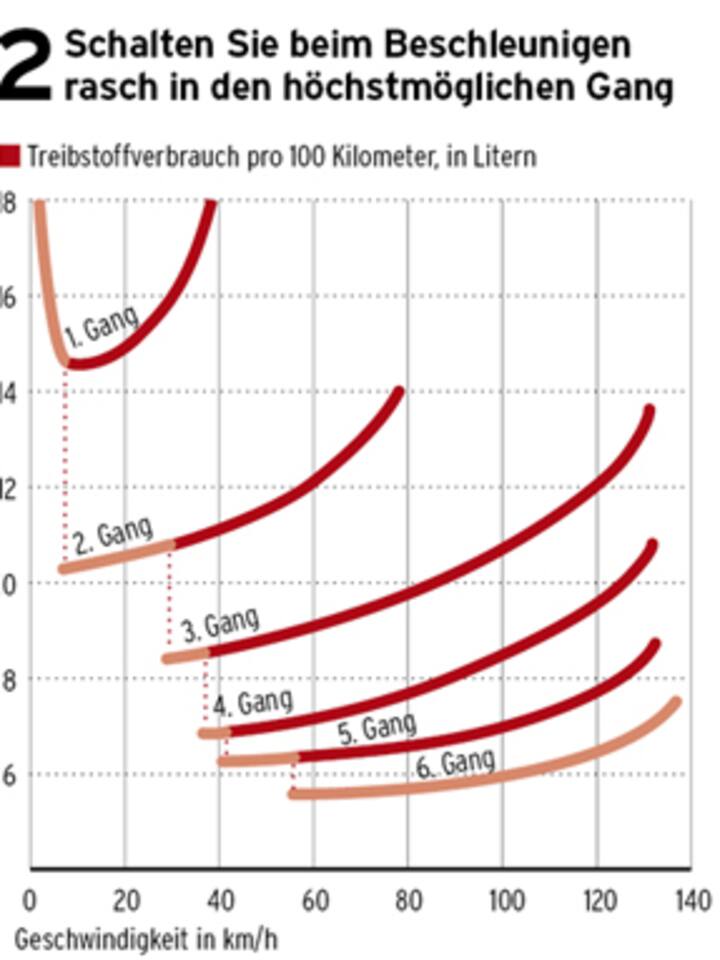 Einmal im Stillstand, lohnt es sich, den Motor auszuschalten, wenn die Pause länger als zehn Sekunden dauert. Die Mär, dass das Anlassen viel Benzin verbraucht, stammt aus Oldtimer-Zeiten, als man beim Starten des Motors aufs Gas drücken musste – das gilt heute nicht mehr. Beim Anfahren sollte man bereits nach einer Wagenlänge in den zweiten Gang schalten. Denn je kleiner die Drehzahl, desto weniger Energie verbraucht der Motor. Dieselmotoren lassen sich bereits ab 1500 Umdrehungen pro Minute in den nächsthöheren Gang schalten, Benziner bei 2500.