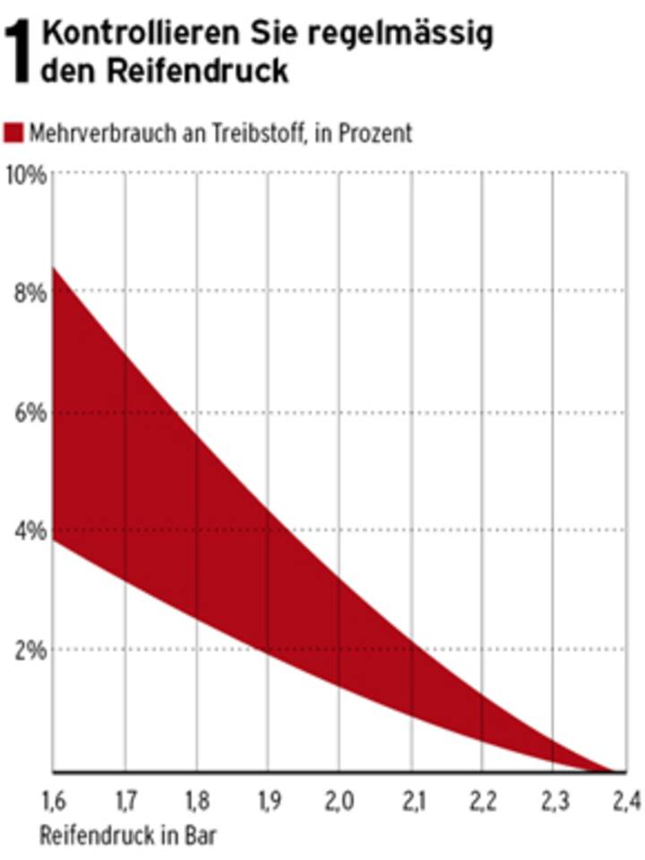 Verbessern lässt sich die Ökobilanz auch mit dem richtigen Reifendruck. Es empfiehlt sich, 0,5 bar mehr Druck in die Pneus zu pumpen als vom Hersteller angegeben. Das ist im Gegensatz zu einem Unterdruck nicht gefährlich. So lassen sich rund drei Prozent Treibstoff sparen. Gemäss Eco-Drive fahren rund 90 Prozent der Schweizerinnen und Schweizer nicht mit dem optimalen Druck. Würden sie ihre Reifen regelmässig kontrollieren und richtig pumpen, liessen sich jährlich 133 Millionen Liter Benzin respektive 306'000 Tonnen CO2 einsparen.