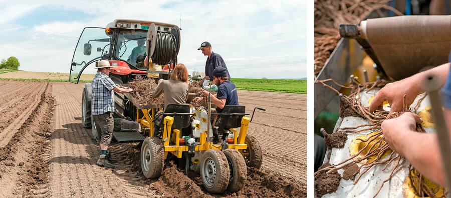 Auf dem Feld kommt eine Spargelpflanzmaschine zum Einsatz. Damit bringen die Arbeiter die Jungpflanzen in regelmässigem Abstand in die Erde.