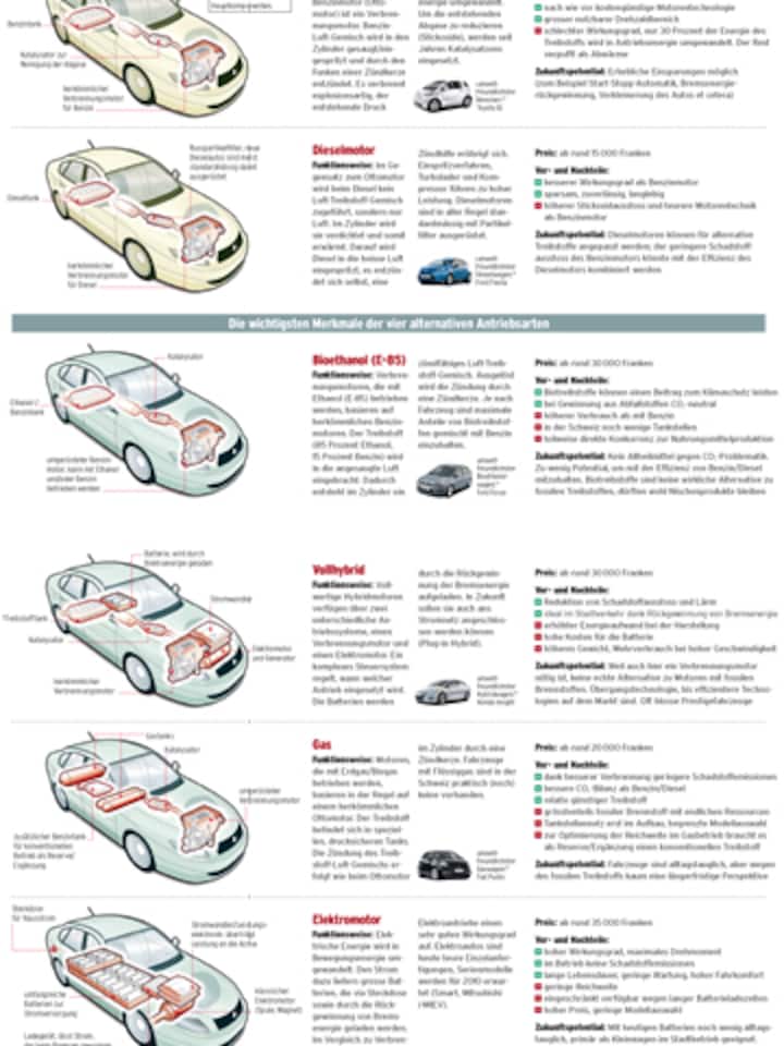 Erdgas- oder Ethanol-Autos haben es in der Schweiz erst recht schwer. Im Unterschied etwa zu Schweden, den USA oder Brasilien gibt es hierzulande nur wenige Tankstellen für alternative Treibstoffe. Zum anderen warnen Fachleute vor übertriebenen Erwartungen. Denn Erdgas ist wie Benzin und Diesel ein fossiler Brennstoff und dürfte langfristig kaum eine Alternative bieten. Bioethanol anderseits wird aus Pflanzen mit hohem Zuckergehalt gewonnen. Auch das ist nicht unproblematisch. Nahrungsmittel verteuern sich, was in Schwellenländern zum Überlebensproblem wird. Das zeigte sich 2007 in der Tortilla-Krise in Mexiko: Der Preis für Maismehl vervierfachte sich, viele konnten sich das Grundnahrungsmittel Tortilla kaum mehr leisten.