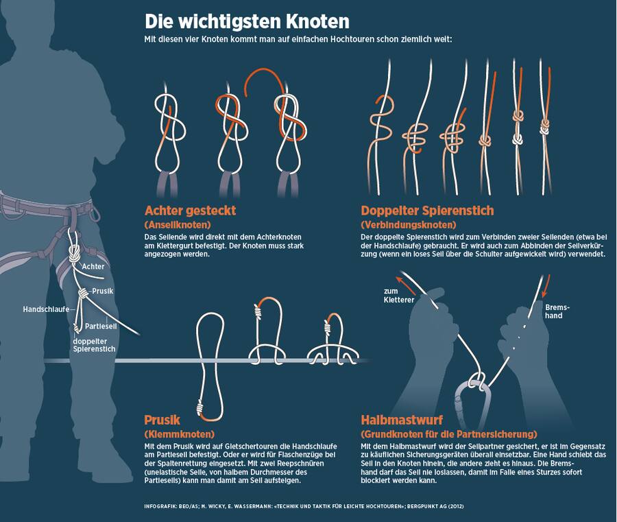 Langsam geht alles besser am Berg. Auch das Knüpfen der Knoten für das Anseilen oder Sichern – eine knifflige Sache. Es geht um die Sicherheit, da muss jede Schlinge sitzen. Und so üben wir Achterknoten, Prusik, Halbmastwurf und doppelten Spierenstich. Mit dem Leitseil muss man haushälterisch umgehen, immer wieder die Seilverkürzung vornehmen – denn für eine Rettung muss genug Reservelänge da sein. Irgendwann schaffen es alle.