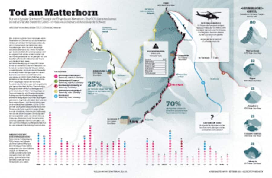 Seit der Erstbesteigung vor knapp 150 Jahren kamen am Matterhorn über 500 Menschen um. An keinem anderen Berg der Schweiz sterben so viele Alpinisten. Und auch die Achttausender im Himalaja fordern weniger Opfer: Am Mount Everest kamen bisher rund 220 Menschen ums Leben, am K2 80. Noch «tödlicher» als das Matterhorn ist das Montblancmassiv: 6000 bis 8000 Bergsteiger starben dort bis heute.