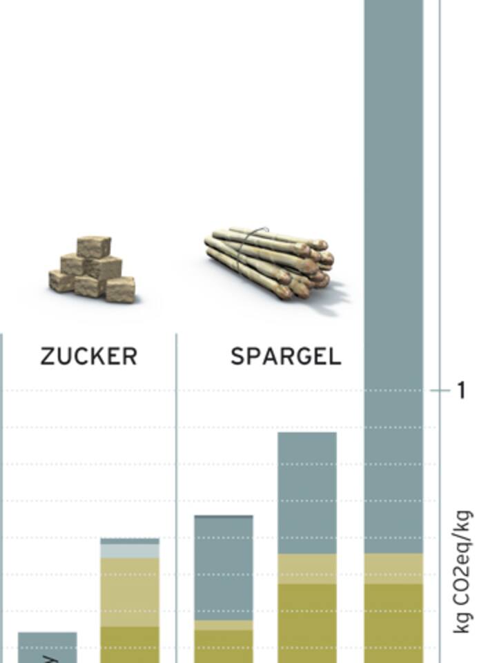 Beispiel Spargel: Verglichen haben die Klimaexperten weissen Spargel aus Ungarn, Deutschland und Peru sowie grünen Spargel aus Mexiko. Spargel, der aus Übersee eingeflogen wird, hat die schlechteste Klimabilanz – er verursacht zwölfmal mehr CO2 als jener, der per Schiff aus Peru zu uns gelangt. Dieser belastet das Klima nur unwesentlich mehr als ungarischer Spargel, der dank besseren Anbaumethoden und günstigem Boden noch klimafreundlicher ist als der badische Spargel.