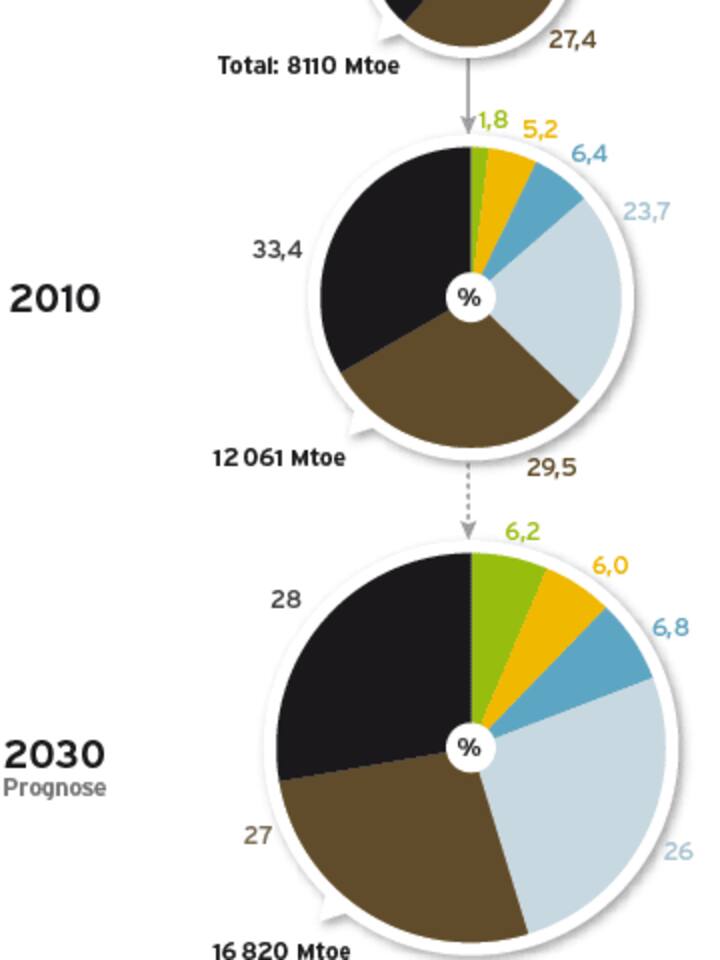 Laut den Prognosen der Internationalen Energie-Agentur wird der Anteil der erneuerbaren Energien bis 2030 zunehmen. Weil der globale Energiehunger wächst, wird der Ölverbrauch trotzdem um zehn Prozent steigen.