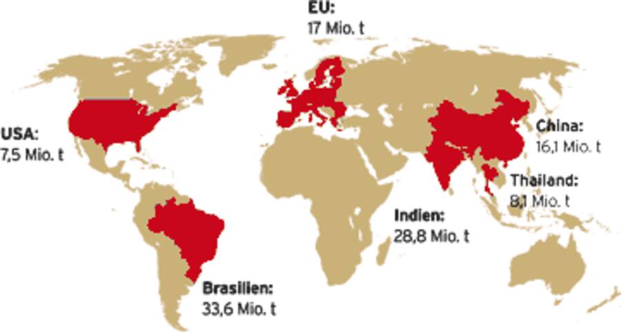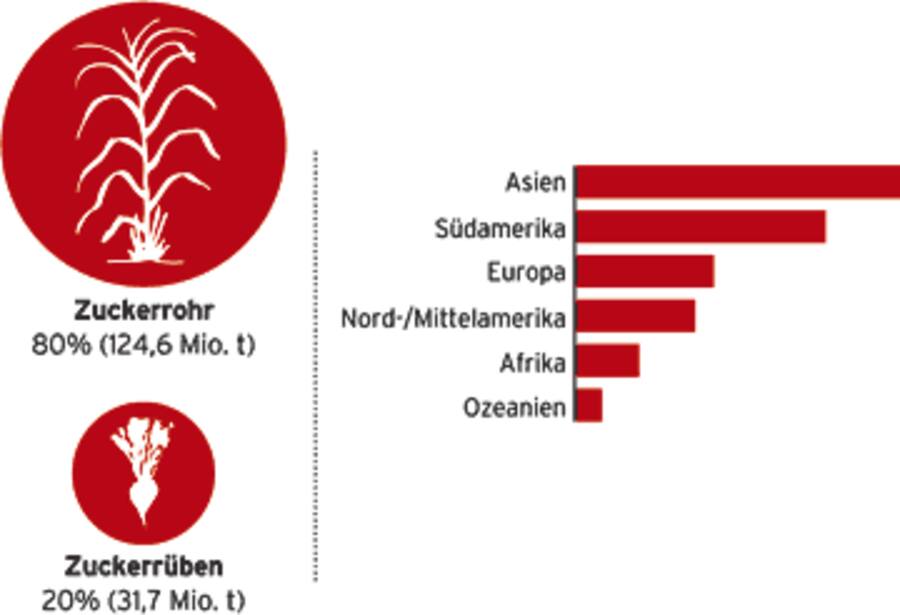Die USA, Brasilien, die EU, Indien, Thailand und China liefern rund 110 Millionen Tonnen oder 70 Prozent der weltweit produzierten Menge an Rohr- und Rübenzucker (Zahlen 2008/09).