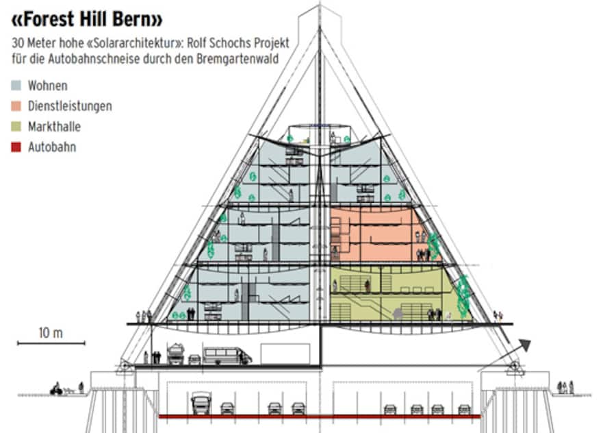 Sein Projekt nennt Schoch «Forest Hill». Es ist ein 30 Meter hoher Häuserhügel. Eine Schrägseilbrücke von über einem Kilometer Länge, mit der er die sechsspurige Autobahn nördlich des Berner Länggassquartiers zudecken und wo er über 1000 Wohnungen und 2000 Arbeitsplätze unterbringen will. Ein neues Quartier, das den Grossen Bremgartenwald vom Autolärm befreit, ohne einen Quadratmeter Land zu verbrauchen. Warum nur ist vor ihm niemand auf die Idee gekommen, wird immer nur neben, nie über der Autobahn gebaut? Weil alle meinen, dieses Land sei endgültig an den Verkehr verloren.