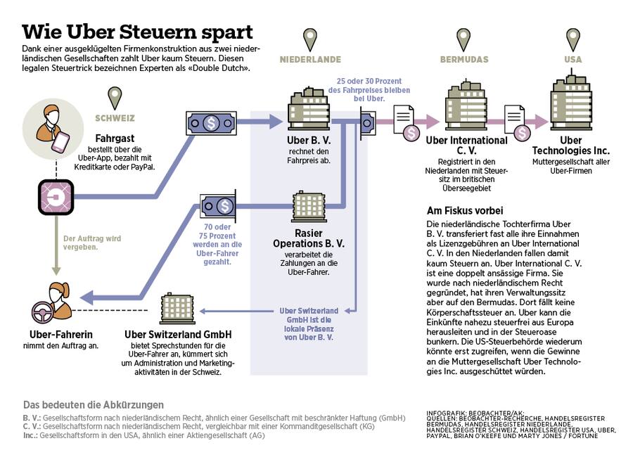 Jede Uber-Fahrt muss mit Kreditkarte oder über den Bezahldienst PayPal beglichen werden. Die Zahlung geht an Uber B. V. in Amsterdam. «Das ist eine Dienstleistung für die Uber-Fahrer», sagt Jalali. Uber B. V. transferiert fast die gesamten Einnahmen als Lizenzgebühren an Uber International C. V. Sie ist eine sogenannte doppelt ansässige Firma, die zwar nach niederländischem Recht gegründet wurde, ihren Hauptsitz aber auf den Bermudas hat. Im britischen Überseegebiet fallen keine Körperschaftssteuern an. Klingt kompliziert, ist aber für Uber sehr einträglich. Der Konzern kann die Einkünfte nahezu steuerfrei aus Europa herausschleusen und in der Steueroase bunkern. Der amerikanische Fiskus wiederum kann nur zugreifen, falls die Gewinne an die Muttergesellschaft Uber Technologies Inc. in San Francisco ausgeschüttet werden. Diesen legalen Steuertrick bezeichnen Experten als «Double Dutch», als doppelten Holländer.