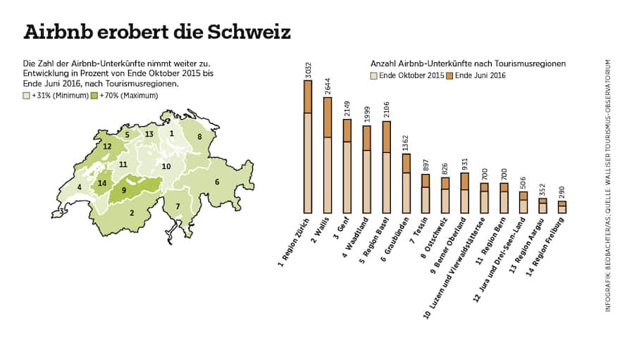 Das Schweizer Airbnb-Angebot ist allein in der ersten Jahreshälfte 2016 um 43 Prozent gewachsen, berechnet Schegg. Aktuell sind gemäss Beobachter-Recherchen rund 18'500 Objekte aufgeschaltet. Hinter 22,5 Prozent der Angebote stehen mittlerweile gewerbliche Vermieter, die mindestens drei Objekte offerieren. Für Christophe Hans, Leiter Wirtschaftspolitik von Hotelleriesuisse, sind es «professionelle Anbieter von Ferien-, aber auch Stadtwohnungen», die diese Entwicklung vorantreiben.