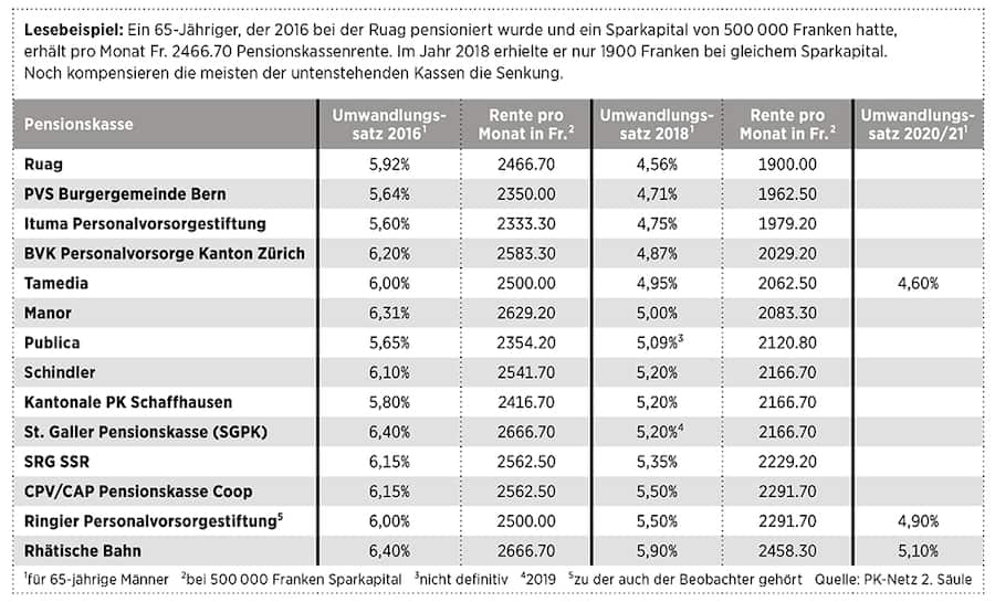 Beim Rüstungskonzern Ruag etwa sinkt der Umwandlungssatz bis 2018 von 5,92 auf 4,56 Prozent. Ein 65-Jähriger mit einem Alterskapital von 100'000 Franken erhält statt 5920 Franken Jahresrente nur noch 4560 Franken, falls der Konzern keine Kompensationsmassnahmen gewährt.
