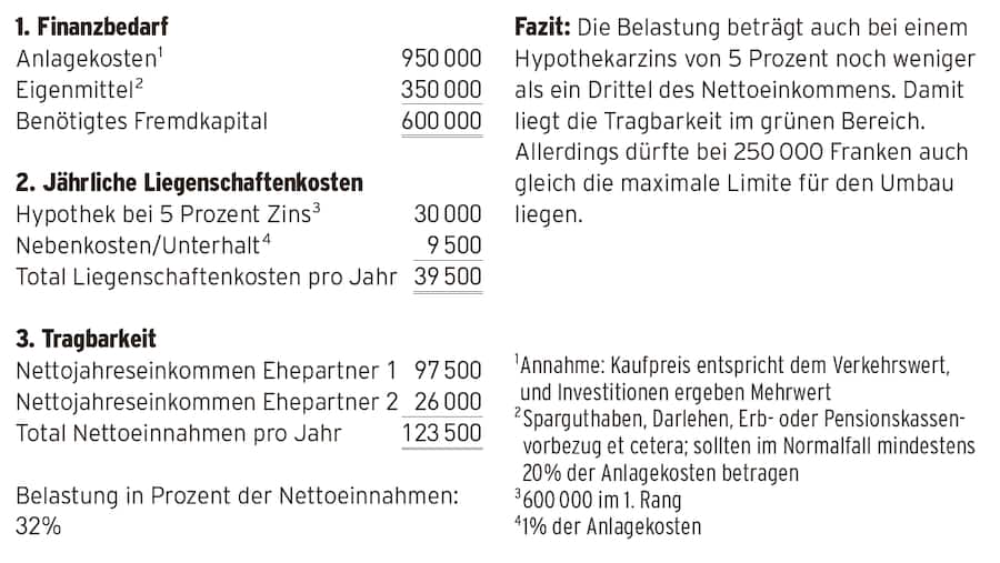 Ein Ehepaar möchte sein Haus, das es vor fünf Jahren für 700'000 Franken erworben hat, sanieren. Es rechnet mit Kosten in der Höhe von 250'000 Franken. 150'000 Franken könnte ein Ehepartner von seiner Pensionskasse vorbeziehen, die Hypothek müsste demnach um 100'000 Franken aufgestockt werden, und zwar von 500'000 auf 600'000 Franken.