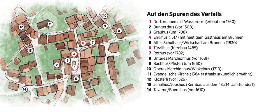 Valendas im Vorderrheintal verfügt über ein Ortsbild von nationaler Bedeutung. Es ist geprägt von einer erstaunlichen Anzahl stattlicher Patrizierhäuser. Entstanden sind sie in der Zeit, als das nahe am Schnittpunkt von internationalen Alpenrouten gelegene Bauerndorf vom Transitverkehr lebte. Daneben kamen die adligen Bewohner, namentlich das Geschlecht der Marchion, bis ins 18. Jahrhundert durch Söldnerdienste zu einem guten Einkommen. Dieses investierten sie nicht zuletzt in die Erweiterung ihrer Residenzen. In einem Rundgang durch Valendas lassen sich diese Zeitzeugen und weitere historische Bauten entdecken. Die Route mit Start und Ziel beim Dorfplatz führt über 14 Stationen (siehe Plan, oben). Heute leben in Valendas und in den umliegenden Weilern rund 300 Einwohner. Seit 2013 gehört das auf einem Plateau über der Rheinschlucht gelegene Dorf zur Fusionsgemeinde Safiental.