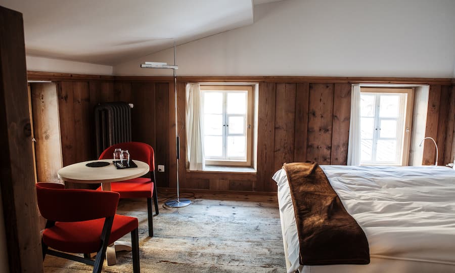 Äusserlich betont der weisse Kalkputz die Einheit von Gasthaus und Saal. Im Innern greifen die Elemente früherer und jetziger Nutzungen ineinander. Sichtbar wird das in den acht Gästezimmern im alten Gebäudeteil. Nur schon die niedrigen Türen zeigen: In den Räumen bleibt die Vergangenheit spürbar. Dazu hat Caminada punktuell moderne Akzente gesetzt – Designsessel, stylische Lampen, in der Dusche bunte Keramikkacheln. Kleine Details, die im Grossen für die Leitfrage stehen, die den Meister bei der Belebung von historischer Bausubstanz am meisten interessiert: «Was kann das Neue im Wechselspiel mit dem Alten?»