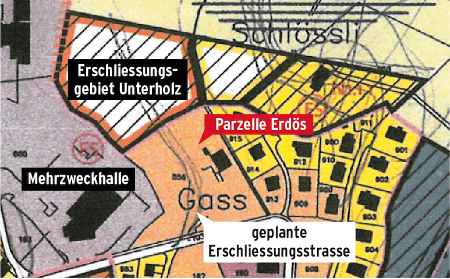 2007 teilte ihr die Gemeinde mit, dass ihr Land gemäss Baugesetz 2013 ausgezont werde, falls es bis dahin nicht bebaut werde. Der Termin setzte Erdös unter Druck, sie beantragte eine Fristverlängerung. Diese wollte die Gemeinde nur in Erwägung ziehen, wenn Erdös den Bau einer Erschliessungsstrasse durch ihre Parzelle zum dahinterliegenden Gebiet «Unterholz» zulasse. Dort wollte die Gemeinde eine grössere Überbauung ermöglichen. Im Richtplan war die Erschliessung jedoch über die gemeindeeigene Nachbarparzelle vorgesehen.