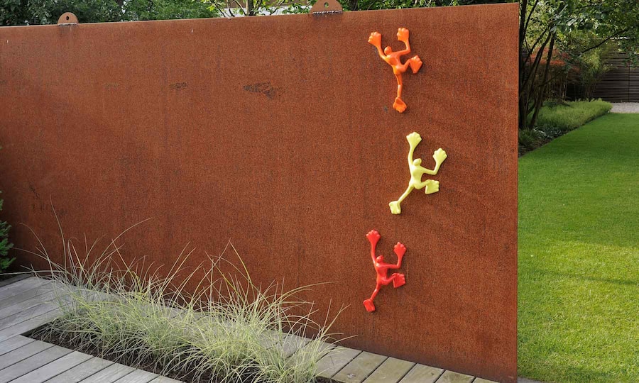 Dieser wetterfeste Baustahl wird seit einigen Jahren vielfach in der Gartengestaltung eingesetzt – zum Teil auch grossflächig. Etwas weniger massiv wirken einzelne Stelen, die mit Gehölzen kombiniert werden.
