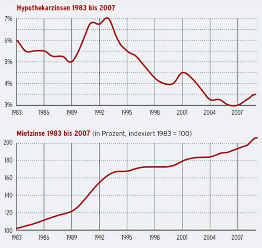 Diese beiden Kurven machen es deutlich: Während die Hypothekarzinsen in den letzten Jahren teils rasant gesunken sind, haben sich die Mieten dennoch ständig aufwärts bewegt. Schuld daran sind unter anderem gestiegene Ansprüche an den Ausbaustandard, höherer Flächenbedarf pro Person und die verbreitete Anwendung von Kostensteigerungspauschalen (Beispiel: Kanton Zürich, jeweils Januarwerte).