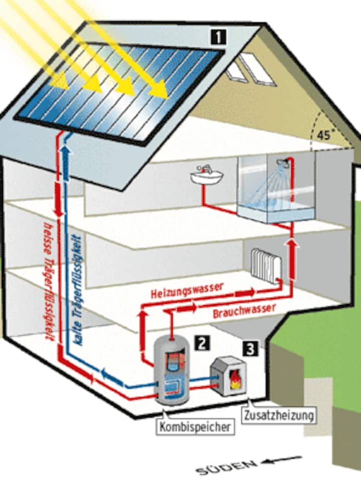 Ist die Ausrichtung des Dachs nicht optimal, kann man die Kollektoren auch aufs Garagendach stellen. Die benötigte Fläche ist nicht riesig: Soll nur warmes Wasser erzeugt werden, ist mit 1 bis 1,5 Quadratmetern pro Person im Haushalt zu rechnen; soll auch die Heizung unterstützt werden, sind für ein Einfamilienhaus zehn Quadratmeter nötig. Letzteres ist aber nur sinnvoll, wenn das Haus einigermassen gut isoliert ist und die Vorlauftemperatur der Heizung nicht allzu hoch ist.